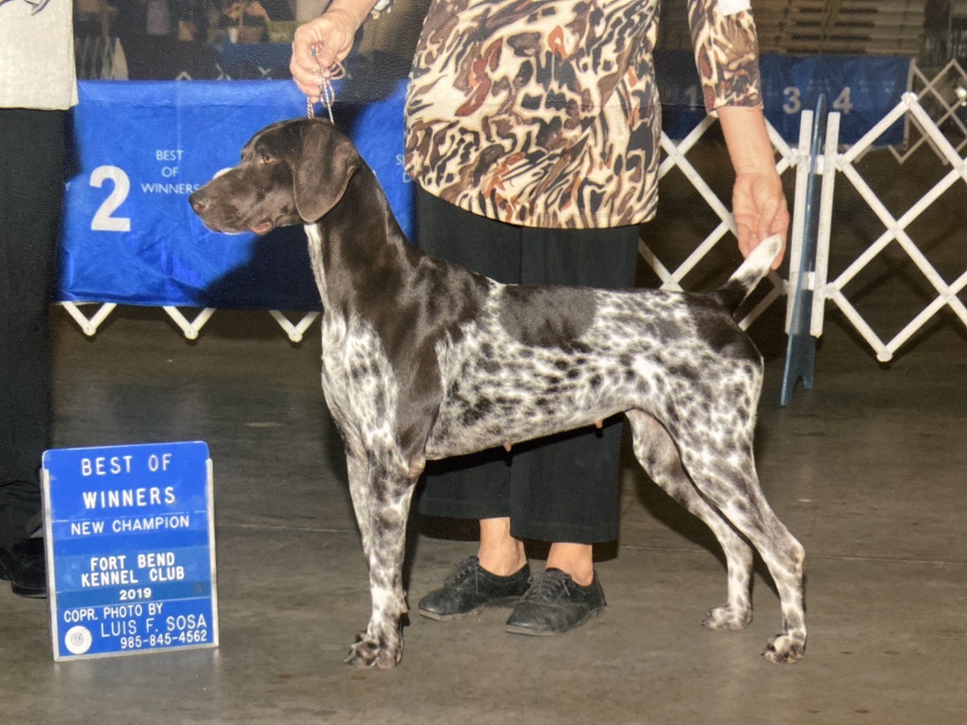 At just over a year old Striker received a 5pt major from the bred by class on his first of only 2 days in the show ring- Gulfcoast GSP Specialty at Reliant 2024 (his littermate brother was RWD!)